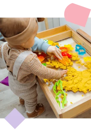 Finger painting with edible paints, stamping with safe objects, or exploring colourful playdough for creative expression and fine motor development.